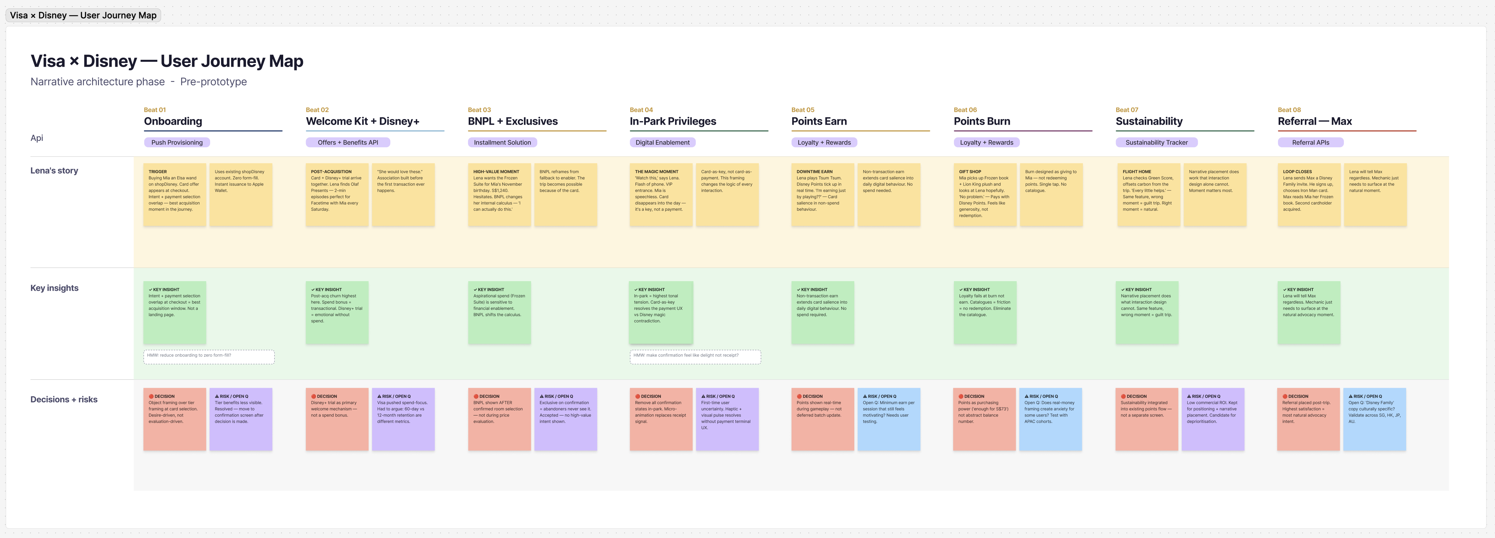 This is the narrative architecture document built during the two-week pre-prototype phase. Eight story beats mapped across four swim lanes: Lena’s journey narrative, lo-fi wireframes showing UI logic, key insights per beat, and design decisions with explicit tradeoffs documented. Every pillar in the prototype traces back to a specific decision visible here.