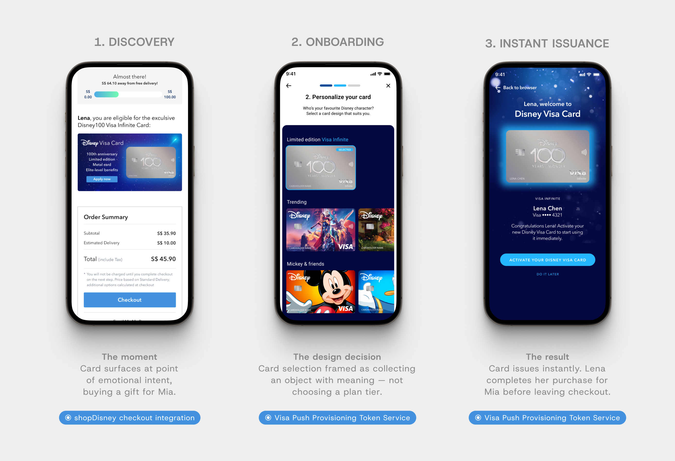 Every component was evaluated against this tension - card designs, notifications, BNPL display, confirmation states, points display. The answer was different for every surface. A product that resolves the tension by choosing one produces either Visa with Disney stickers applied, or a Disney product that feels unsafe to hand over your card details to.