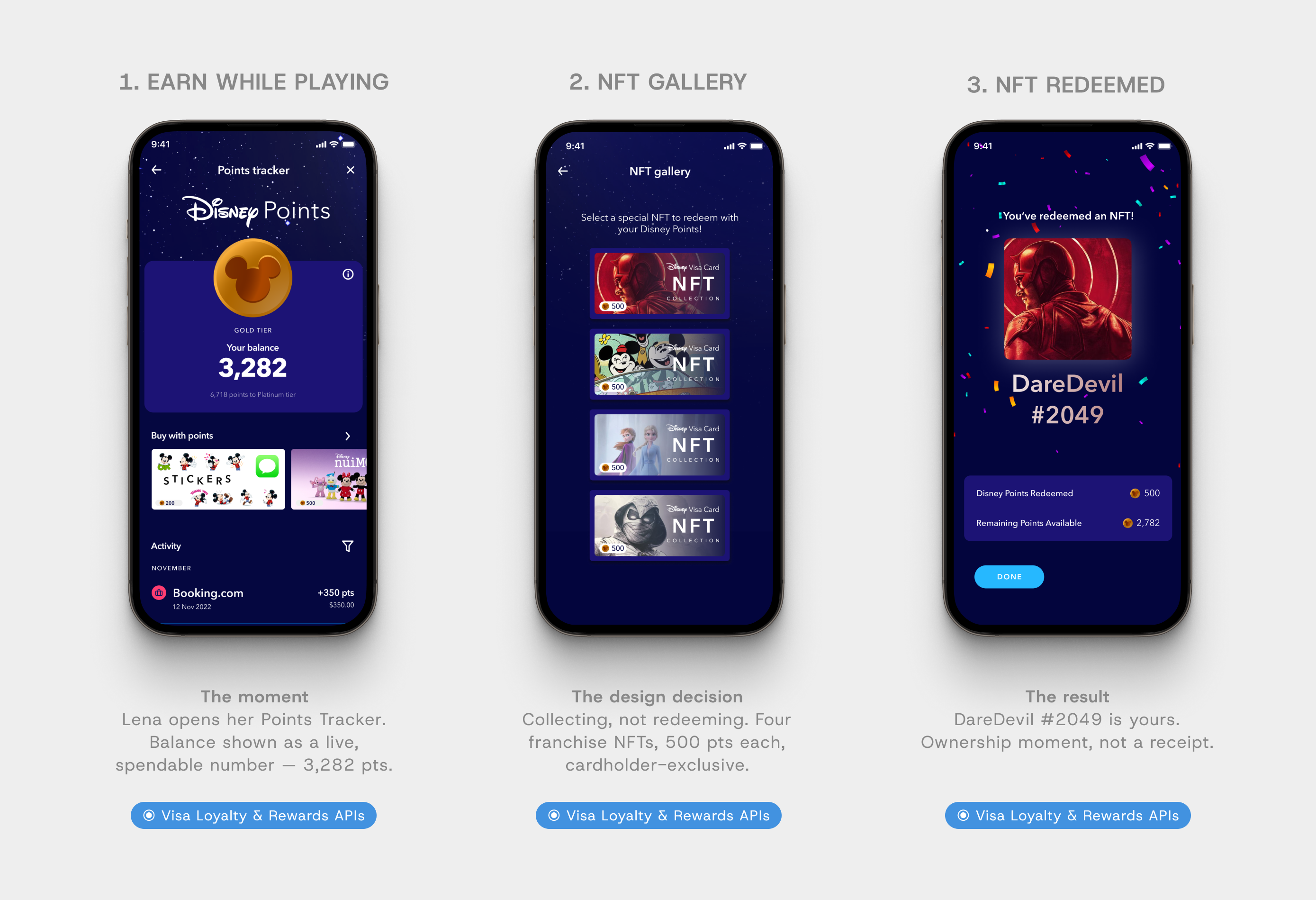 Burn framed as collecting, not redeeming. NFTs give points a reason to spend that feels like owning something rare — not a transactional exchange.